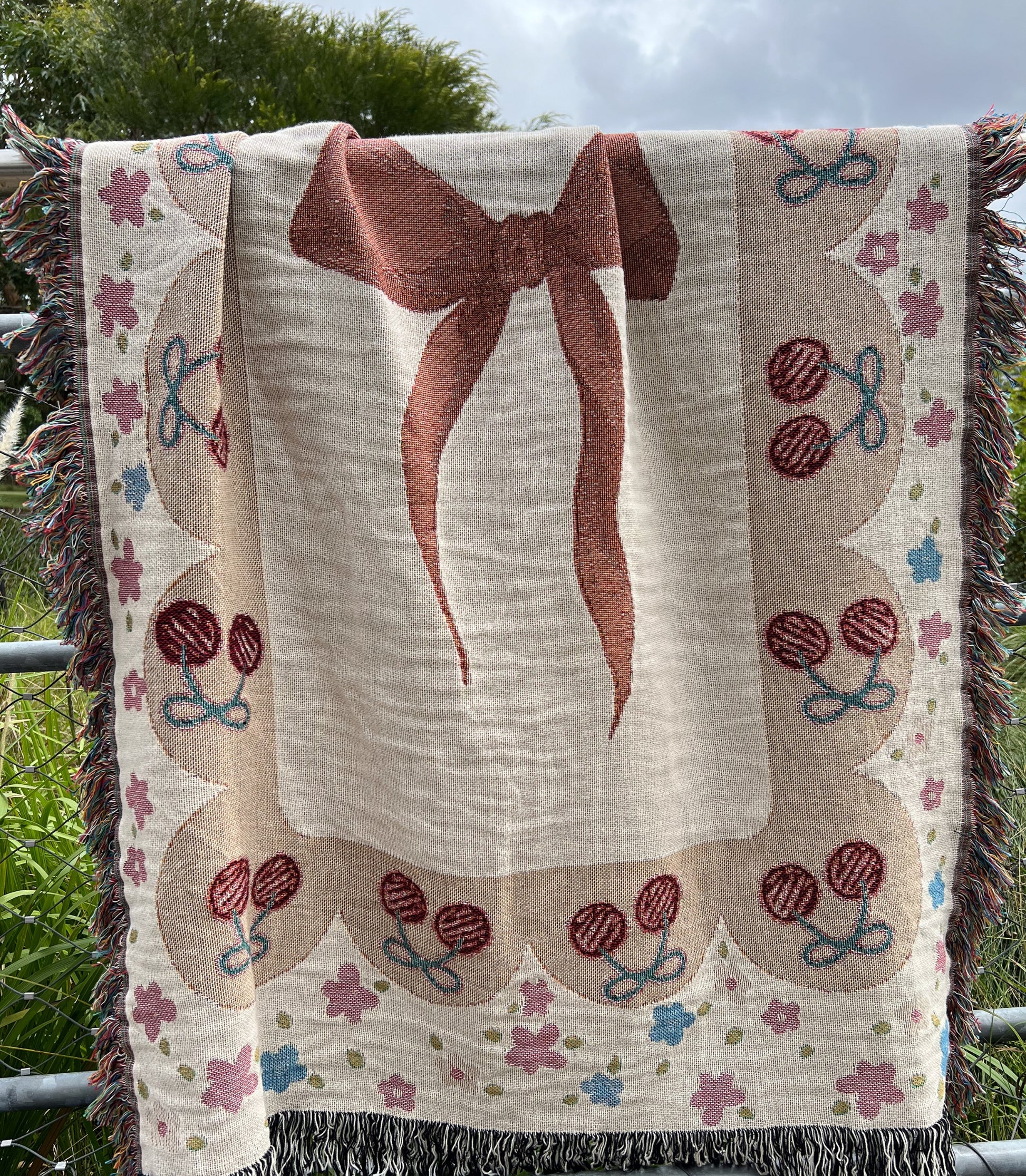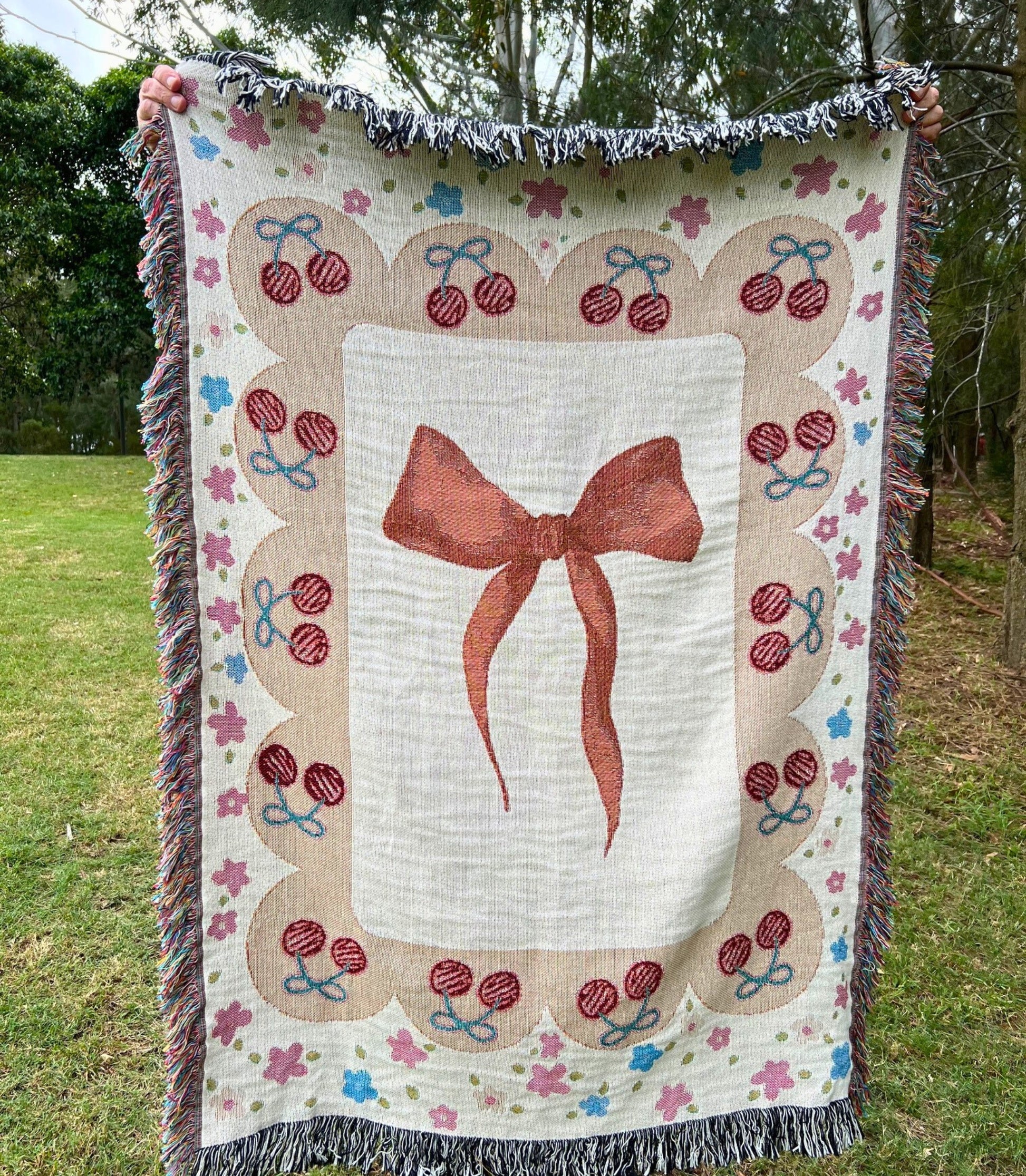 Add a touch of elegance to your space with this cherry bows woven throw blanket, made in the USA from100% soft cotton and perfect for every season. Designed for lovers of cottagecore, coquette, and French-inspired aesthetics, this cotton woven blanket features delicate pink ribbons and bow details, perfect for creating a dreamy and feminine atmosphere. A must-have for French bow and girly decor lovers!